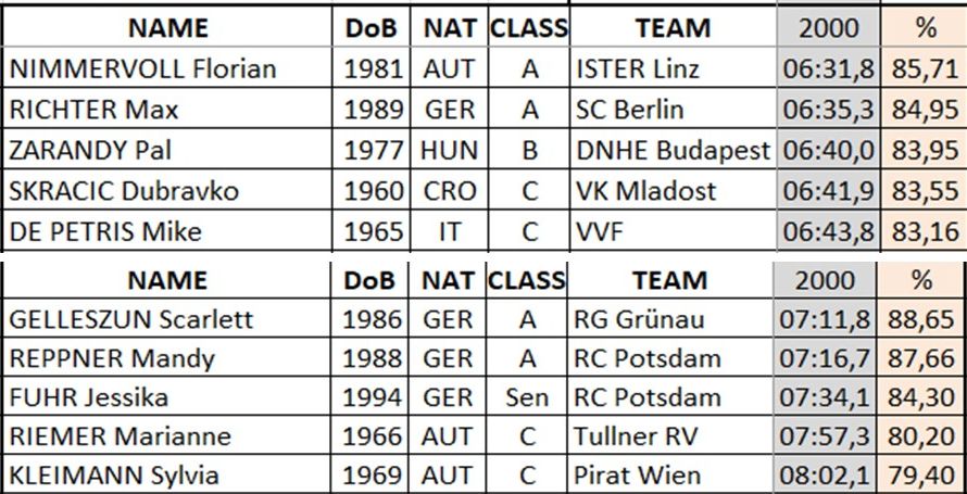 Four athletes managed to do the 2000 meters in under 8 minutes. Many of the male participants had to admit that Scarlett GELLESZUN’s winning time of 07: 11.8 minutes was an absolute top time. There is the uncontested leadership of the trio Scarlett GELLESZUN (RG Grünau), Mandy REPPNER (RG Grünau) and Jessika FUHR (RC Potsdam). Behind them there is a tough battle for fourth and fifth place by Sylvia KLEIMANN (Pirate Vienna), Szilvia Mercedes BOROS (GYAC Györ), Marianne RIEMER (FV Tulln) and Karina ZEHETNER (LIA Vienna).