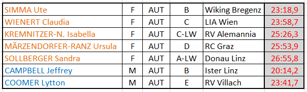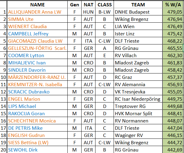 Sicher die interessanteste Ergebnisliste, wird doch jede*r nach seinem Alter, Geschlecht und Gewicht in Relation gesetzt, und so ergibt sich ein Ergebnis, welches von der ehemaligen internationalen Leichtgewichtsruderin ALLIQUANDER Anna aus Ungarn angeführt wird. Aber nur wenige, bis gar nur zehntel Punkte trennen die weiteren Platzierungen.