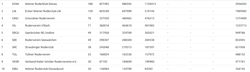 A look at the club rankings reveals a considerable lead for Donau Wien over LIA Wien. Third place is now held by Ruderverein Gmunden, just ahead of Ruderverein Villach. The overall performance of the clubs is also strong, meaning several teams still have a chance to join the Million Meter Club.